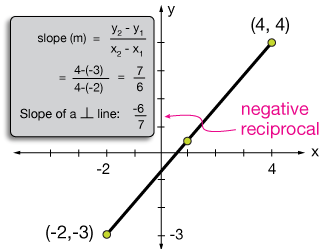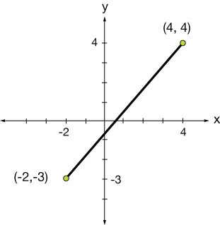 The slope of the segment with endpoints $(-2,-3)$ and $(4, 4)$ is calculated here. As usual, the slope of a line is just the change in $y$ ($\Delta y$) divided by the change in $x$ ($\Delta x$) between two points.