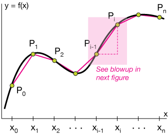 The figure shows the basic geometry. Each point $(x, f(x))$ is labeled $P_1, p_2, \dots p_{i-1}, p_i, \dots , p_n$, where we break our curve into $n$ pieces.
