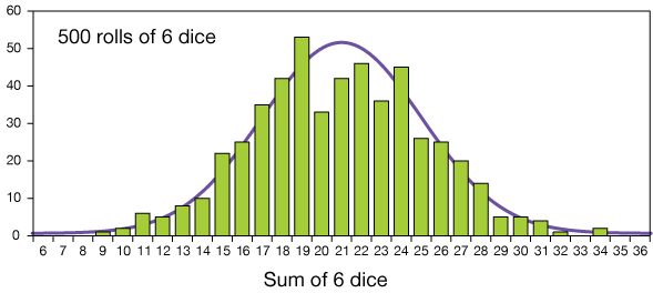 Now there are many more possibilities for that sum, from 6 x 1 = 6 to 6 x 6 = 36. The graph below shows a simulation, done with a spreadsheet, of 500 throws of 6 dice. There are so many possible values of the sum in this case that the distribution of the bars in the graph kind of meld together, and get very close (with some "noise" or unavoidable random fluctuations) to the purple normal distribution in the back.