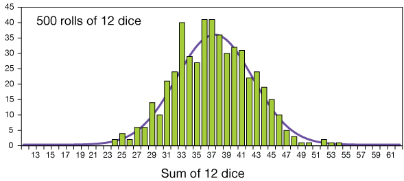 OK, let's take this example a little bit farther and toss 12 dice 500 times. Now there are many more possible values for the sum (from 12 to 60), and you can see (again with a bit of noise – random fluctuations) that the distribution is very close to a normal distribution.