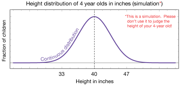 Now let's consider a real continuous distribution. By looking at some census data, I've simulated the distribution of the heights of 4-year-old children (in inches) in the United States. Assuming that medical workers try to measure heights precisely and accurately, these are truly continuous data.