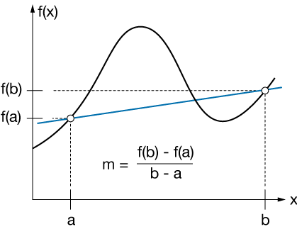 The function below shows calculated derivatives evaluated two points, $x = a$ and $x = b$. These are just the slopes of the lines tangent to those points at $x = a$ and $x = b$.