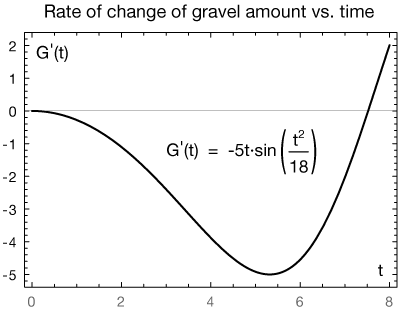 Here is a graph of our derivative vs. time over the domain of the function, $[0, 8]$. Notice that we lose gravel for the first 5.5 hours, then gain it back.