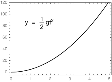 The graph shows a plot of falling distance ($y$) vs. time ($t$). The curve is quadratic in time.