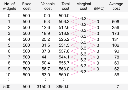 Consider a factory that produces widgets*. The table below outlines some key numbers for the production of up to 500 widgets by such a factory. The manufacturer has fixed costs of operation that amount to $500.00, say, per day. Those could include rents, salaries, &c. The variable costs are those that are generated by the production of each widget. In this case that's $6.30 per widget (3rd column of the table). I'll explain the rest of the table below.
