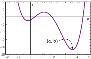 We won't always know the exact location of that max. or min. That's a problem that calculus will help you with later. In such cases, it's OK just to give that max. or min. a label like we did in the graph, $(a, b)$. The minimum value of the function is just $b$ (a negative number in this example), and we write the domain and range like this: