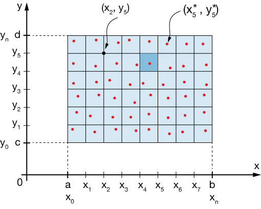 $$V \approx \sum_{i=1}^m \sum_{j=1}^n f(x_i^*, \; y_j^*) \Delta x \Delta y$$