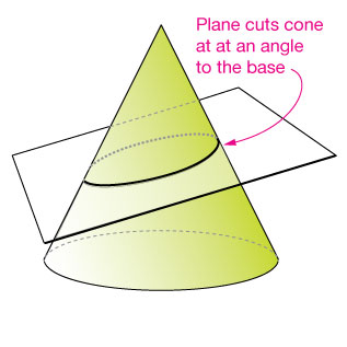 An ellipse is one of the so-called conic sections, figures that result from slicing a right-regular cone in one of three ways. The figure below shows how that works for an ellipse. There is only one way to form a closed figure by slicing a cone, and that's to do it without intersecting the base. If that cut is made parallel to the base we end up with a circle, which is just a special case of the ellipse. Any other such cut is an ellipse.