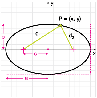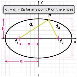 We need to find a formula for the location of any point (x, y) on the ellipse, given that we know that the sum d1 + d2 is constant.