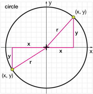 where r is the radius of the circle. Here's a drawing of that. Two points are highlighted on the circle and the relationship between their x- and y-coordinates to the radius is in the right triangles and the Pythagorean theorem.