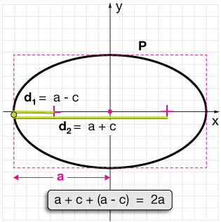 Now take a look at the figure below, in which the point P has been moved to a location along the major axis of the ellipse (the overlapping lines d1 and d2 have been moved apart a little so you can see both of them). If a is the dimension shown (the semi-major axis length), then the length of d1 in this position is a - c, where c is the distance from a focus to the center. Likewise, the length of d2 is a + c. Adding those, we get