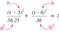 If the length of the major axis is 15 units, then a = 15/2 = 7.5 units, and a2 = 56.25. Likewise, b = 6 and b2 = 36; we just plug those into our basic form and we have the equation of our ellipse.