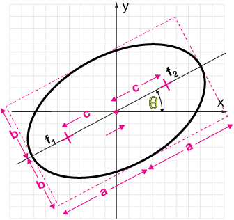 $$\frac{(x \cdot cos(\theta) - y \cdot sin(\theta))^2}{a^2} + \frac{(x \cdot sin(\theta) + y \cdot cos(\theta))^2}{b^2} = 1$$