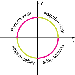Does the derivative make sense? The graph of this function is a circle centered at the origin, so we expect a positive slope in the 2nd and 4th quadrants, and a negative slope in the 1st and 3rd, just what we get from this derivative. Here's a picture of that: