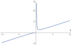 Notice that the limits at x = 0 are different from the left and the right. We can work it out using L'Hopital's rule: