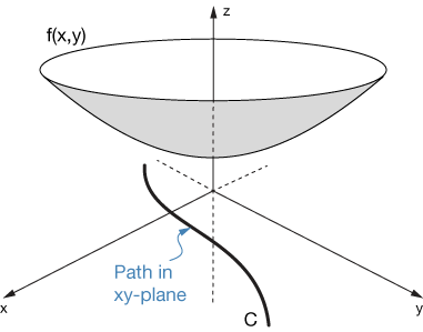 Here's the basic idea of the line integral. Imagine that we have some 3D function, $f(x,y)$, shown here as an upward-opening paraboloid — but it could be any continuous function. Then we have a path of some kind in the $xy$ plane, labeled $C$ in the graph. According to our original analogy, the $f(x,y)$ is our snowfield and $C$ our path through it.