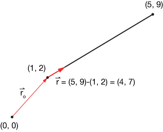 $$ \begin{align} \vec r &= (5,9) - (1,2) \\[5pt] \vec r &= (5-1, \; 9-2) \\[5pt] \vec r &= (4,7) \end{align}$$