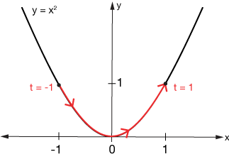 As a simple example, suppose we wanted to integrate over the path formed by $y = x^2$ between $(-1,1)$ and $(1,1)$. One parameterization could be to set $x=t$, then $y=t^2$, and the limits of $t$ would be $-1 \lt t \lt 1$. We could also set $y=t$, then $x=\sqrt{t}$, and so on. In this graph we've used the first parameterization. Notice that as the parameter (often interpreted as time) grows, we move along the curve from left to right