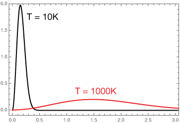 Finally, here are two M-B distributions at T = 10K and T = 1000K. Notice that at low temperature, the distribution is "tight." The fastest and slowest particles have speeds very close to the most probable speed, but at high temperature, those speeds are much more "smeared out." The area under these curves is also equivalent.