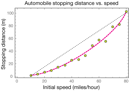 The graph below shows automobile stopping distance plotted against the speed of the vehicle before the brakes are engaged. It's easy to see that a curved model would fit the data better than a linear one. In fact, in this case we know from the laws of physics that the relationship is quadratic — inversely quadratic in this case.