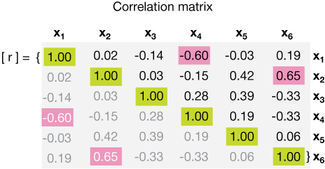 In such a case, we would want to get an idea about the independence of the variables $x_1, \dots , x_n$. To do that we can calculate (I won't say how here) a matrix of correlation coefficients. It might look like this one (which is made up).