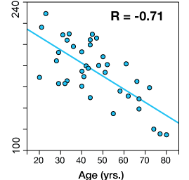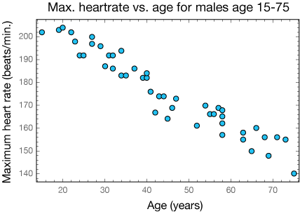 For example, in the graph below, the maximum heart rates of 47 men aged 15-75 are plotted against their ages. The data show that as a man ages his maximum heart rate tends to drop in a reasonably predictable way.