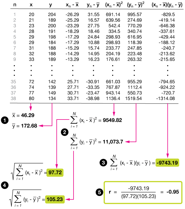 The table below shows just such a calculation using a spreadsheet. I've left some of the values out, but they are the data used on the left plot ($r = -0.95$) above. The key to such a calculation is organization.