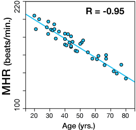 The graph shows a correlation between maximum heart rate (MHR) and age. It's clear that while the data doesn't form a perfect line, it looks like it might "want to be" a line with a negative slope. That is, it sure seems like maximum heart rate decreases as men age, and that we might even be able to find a mathematical relationship between the two.