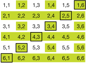 $$ \Omega = \begin{Bmatrix} 1,1 & 1,2 & 1,3 & 1,4 & 1,5 & 1,6 \\ 2,1 & 2,2 & 2,3 & 2,4 & 2,5 & 2,6 \\ 3,1 & 3,2 & 3,3 & 3,4 & 3,5 & 3,6 \\ 4,1 & 4,2 & 4,3 & 4,4 & 4,5 & 4,6 \\ 5,1 & 5,2 & 5,3 & 5,4 & 5,5 & 5,6 \\ 6,1 & 6,2 & 6,3 & 6,4 & 6,5 & 6,6 \end{Bmatrix}$$