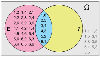 The gray elements are in the sample space for throwing two dice, but they are not in either set {E} or {7}.