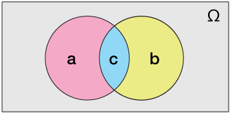 Consider a probability sample space, Ω, with three possible outcome sets, A, B & C, shown here in a Venn diagram: