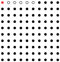 Now that seems pretty small, given that the test is 95% accurate at detecting disease. The hitch is that the prevalence of the disease is so small; just 1% of people have it. Let's see if our answer makes any sense graphically. Here is a sampling of 100 people (dots). The red dot is our one person (on average) with the disease.