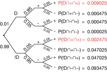 $$ \begin{align} P(+) &= P(D \cap +) + P(!D \cap +) \\[5pt] &= 0.0095 + 0.0495 \\[5pt] &= 0.059 \end{align}$$