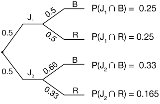 $$P(J_1|B) = \frac{\frac{1}{2} \frac{1}{2}}{\frac{7}{12}} = \frac{3}{7}$$