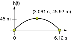The form of the graph gives us our solution. The right-hand root is at 6.12 s. That's how long the ball was in the air. We can also see that its maximum height was 45.9 m, and that half of the time of flight was going up, the other half down. That's because of the mirror symmetry of the quadratic function.