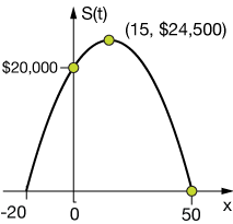 Now it's easy to see that this function has a maximum, and that it represents the maximum number of sales dollars. Here's how we interpret the results. The value of x at the maximum is 15, which represents 15 \$1.00 increases in price, to a total price of \$20 + \$15 to \$35. That means the total number of sales will drop to 1000 - 15(20) = 700 sales.