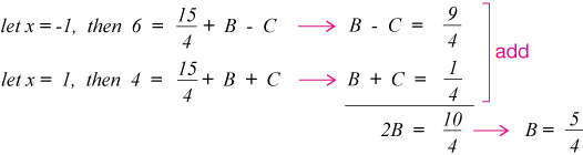 Now with $A$ and $C$ in hand, we can set $x$ equal to any other value and solve for $B$, but $x = 1$ is very convenient.