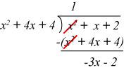 We can now substitute a polynomial plus a much simpler rational function (the remainder) for the original integrand:
