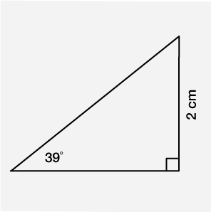 $$ \begin{align} tan(39^{\circ}) &= \frac{2}{a} \\[5pt] a &= \frac{2}{tan(39^{\circ})} = 2.5 \, \text{cm} \end{align}$$