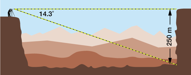 A surveyor knows the depth of the canyon and can measure the angle shown. Calculate the distance from one side of the canyon to the other.