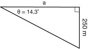 $$ \begin{align} tan(14.3^{\circ}) &= \frac{250}{a} \\[5pt] a &= \frac{250}{tan(14.3^{\circ})} = 981 \, \text{m} \end{align}$$