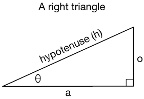 Most of the trigonometry you'll ever need to do involves right triangles, though we'll generalize this to any triangle, and do a lot of other interesting things later. Take a look at the right triangles on the right so we can be on the same page with our terms.