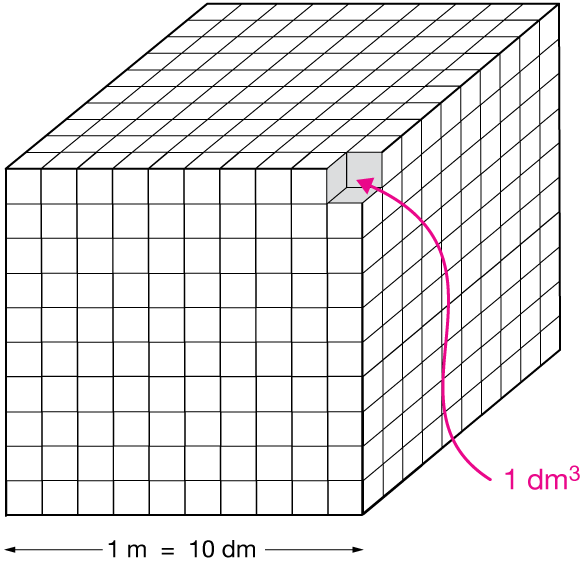Notice that the term (1 m/10 dm) is cubed. This must be so to cancel the dm3 in the term before it, and we must cube the entire term in the parentheses. The result of cubing that term shows us that there are 1000 (103) cubic decimeters (or liters) in every cubic meter. The diagram illustrates that.
