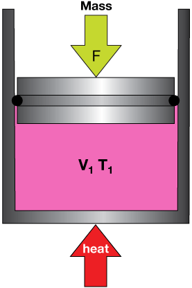 In chemical systems, work is generally done when a system, such as a gas, expands against a force or is compressed under one. For example, when we heat a container of gas with a movable piston that keeps it at a constant pressure (diagram), its temperature rises, and its volume must also rise:
