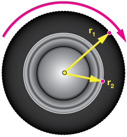 Consider the car tire show here. Let's think about two points on the tire. One on the surface, at a radius of $r_1$ from the center, and one at a shorter radius, $r_2$.