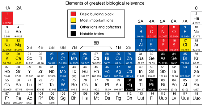 A relative handful of elements are key components of biological systems on Earth. Carbon, Nitrogen, Oxygen, Phosphorus, Sulfur and Hydrogen are the backbone atoms of all proteins, nucleic acids, carbohydrates and lipids.