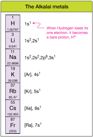 The hallmark of this group is that the electron configuration of each element is that of the inert gas just "behind" it in the table, plus one electron in the next higher s-orbital.