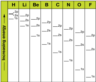 Nature always seeks the state of lowest energy. It's why a ball rolls downhill spontaneously, but never up. At right are the 1s, 2s and 2p orbital energies of a few atoms in the first and second rows of the table. Notice that as we add electrons the energies decrease (but remain in the same order). By the time we get to Neon, with 8 electrons in the n=2 shell, the atom so stable it is inert (doesn't react).