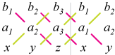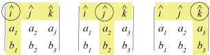 Using the diagonals, the x, y and z components of the cross product vector are the differences between the products indicated by the magenta diagonals and those indicated by the green diagonals. Thus we have