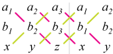 $$ \begin{array}{rrr|rr} a_1 & a_2 & a_3 & a_1 & a_2 \\[5pt] b_1 & b_2 & b_3 & b_1 & b_2\\[5pt] x & y & z & x & y \end{array}$$